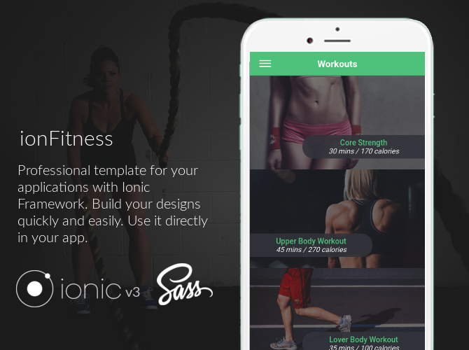 ionFitness is a elegant design. Built with Ionic v3 and SASS. Ready for use in a fitness category project, it has counter animations, run it, customize it and you're done.